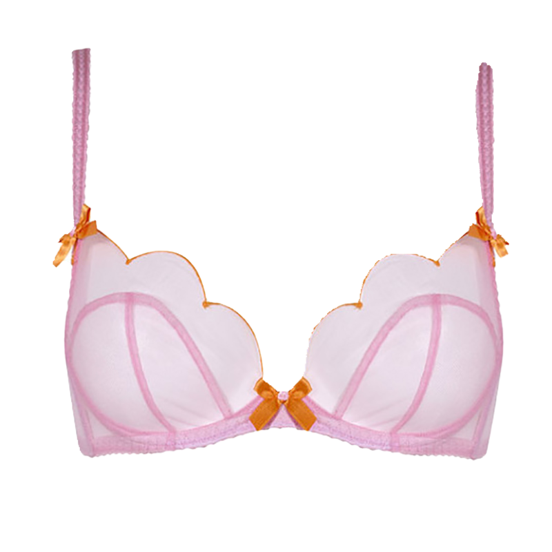 The irrepressibly charming Lorna is back, joining our Icon range in a freshly reworked design and an improved fit. Effortlessly elegant with a girlish twist, this nude pink brief is crafted from an invisible net tulle base with a contrasting black opaque trim, with scalloped-edged detail and a centre front black bow with a pink rosebud, repeated at the rear.