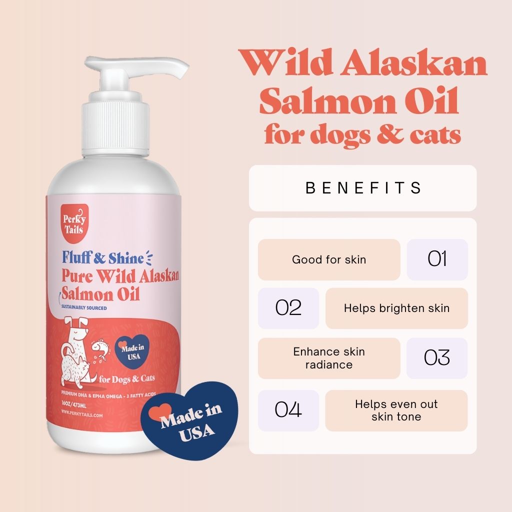 Perkytails Pure Wild Alaskan Salmon Oil for Dogs and Cats is a premium omega-3 fish oil that is great for skin and coat, joint, brain health and overall immunity!