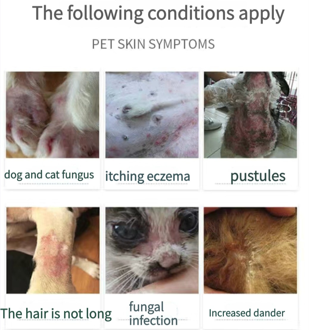 Effect: Treat tinea dog, tinea cat, dermatitis, purulent skin, eczema, itching, mites, redness, swelling, bumps, and hair loss