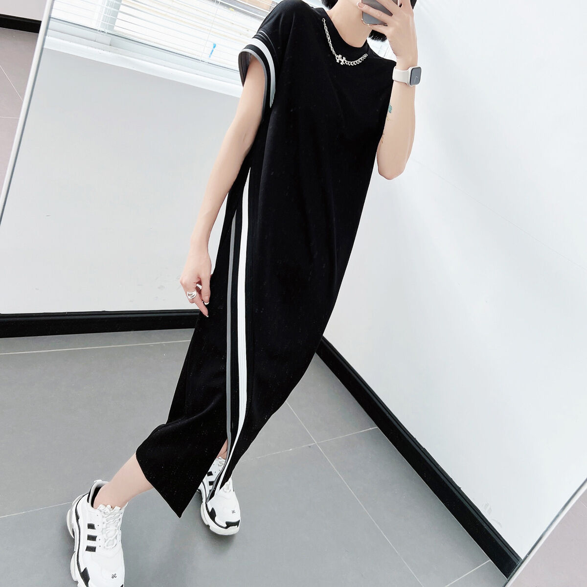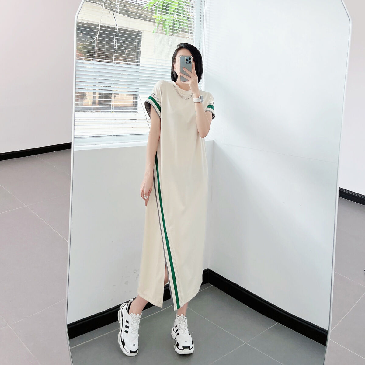 100.00kg Chubby Girl Summer K-style Women's Mid Length Long Length A- line Skirt Elastic Waist One Breasted Pocket plus Size Skirt