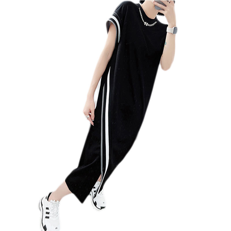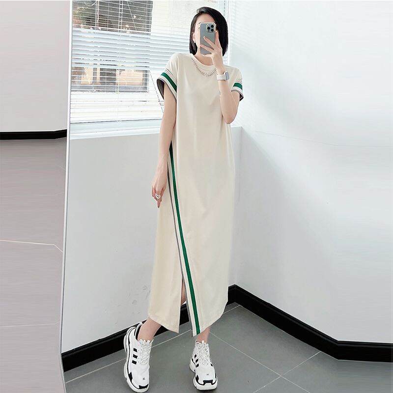 Summer Plus size women clothing Fat mm 1.00 Kg-150.00 kg Shoulder Dress Short sleeve Loose Slimming Belly Covering over the Knee Long Skirt