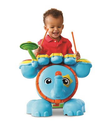 Get ready to rock with the Safari Sound Drums ™ by VTech®. Encourage your little one to be a star while they enhance creative thinking and motor skills by tapping out beats and creating their own sounds using the included drumsticks! They will enjoy this fresh way to practice counting and develop coordination while following along with the melodies and sing-along songs! Four game modes let your child tap the drums to learn counting, catch the lights, follow the leader or create their own composition. Your mini musician will love sitting on the stool and stepping on the elephant bass pedal to see the elephant trunk move up and down and create a fun bass sound effect. Watch them jam out to the beat of their own drum and create some sweet rockin' tunes!