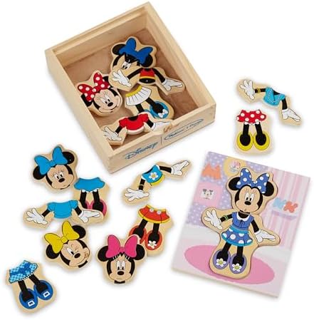 MINNIE MOUSE DRESS-UP SET: Melissa & Doug Disney Minnie Mouse Mix and Match Dress-Up Wooden Play Set includes mix-and-match pieces to create and change looks. MIX-AND-MATCH OUTFITS: Mix-and-match 18 wooden pieces to create fabulous fashions Minnie would be proud to wear. GREAT FOR TRAVEL: Comes in an easy-to-carry storage tray to bring the creative expression and imaginative thinking on-the-go. GREAT GIFT FOR AGES 3 TO 6: Makes an exceptional gift for kids ages 3 to 6. Add the Melissa & Doug Disney Sleeping Beauty and Snow White Magnetic Dress-Up Wooden Doll Pretend Play Set to round out the pretend play and screen-free play experience. “THE GOLD STANDARD IN CHILDHOOD PLAY”: For more than 30 years, Melissa & Doug has created beautifully designed imagination- and creativity-sparking products that NBC News called “the gold standard in early childhood play.”