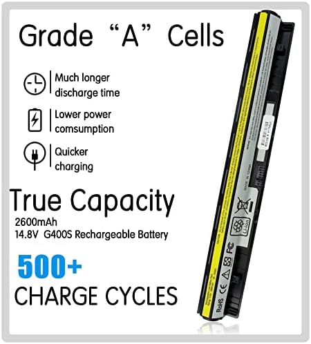 Battery type: Li-ion; Voltage: 14.8V; Capacity: 2600mAh; Cells: 4-Cells; Color: Black Fit for Lapotp Models: Lenovo IdeaPad G400S G405S G410S G500S G505S G510S S410P S510P Z710 Z40 Z40-70 Z50 Z50-70 Z70 G40-70 G50-30 G50-45 G50-70 G50-80 Compatible with P/N: L12L4A02 L12L4E01 L12M4A02 L12M4E01 L12S4A02 L12S4E01 L13S4A01 121500171 121500172 121500173 121500174 121500175 121500176 90202869 100% Brand New from factory/manufacturer. Rechargeable Up to 500 cycls over life of battery; High energy efficiency and extended battery life. Warranty: 12 months Warranty, 30 days money back guarantee, 24 x 7 Email Support.
