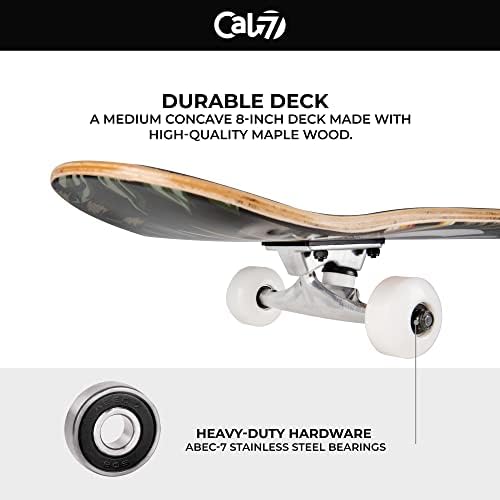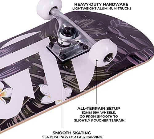 DURABLE DECK — A medium concave 8-inch deck made with high-quality Maple wood.    READY-TO-RIDE — Includes 52mm 99A wheels and pre-applied griptape.    HEAVY-DUTY HARDWARE — Lightweight aluminum trucks and ABEC-7 stainless steel bearings.    SMOOTH SKATING — 95A bushings prevent wheel bite and provide easy carving.    1-YEAR WARRANTY— Covers against manufacturer defects for up to a year.