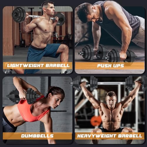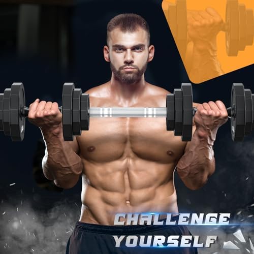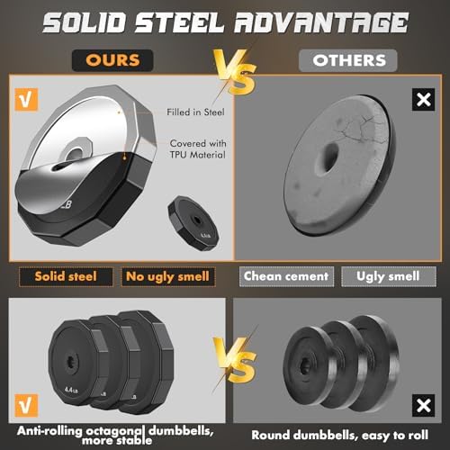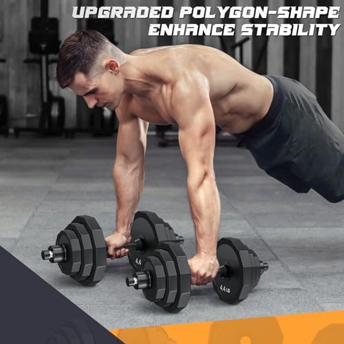 More Adjustable Weights Dumbbells Set Options: With a wide range of weights from 8lbs to 22lbs, these dumbbell set can be assembled as a barbell, allowing you to adjustable your weight to meet your training needs.Fitness dumbbells sets for women men.    Upgraded Solid Steel Material with Stable: Compared with the other cement material dumbbells on the market,our adjustable dumbbell set are made of solid steel,thinner,more stable, stable and true weight. Dumbbell weights plate coated is made of TPU material, high security, unbreakable,soundproof and protects the floor. Polygonal design prevents scrolling and makes for easy storage and use.Chrome connecting rod is knurled to ensure a firm grip,while the rubber-coated handle prevents slipping.    Perfect for Strength Training: Not limited to workout equipment combinations, this dumbbell weights set comes with a connecting rod and can be assembled as a barbell to improve full-body muscle training. Adjustable design helps fitness enthusiasts increase their strength, burn fat, and shape their bodies.Dumbbells offers a better training way than other home gym equipment. Realize your home gym dreams with just a set of dumbbells. Perfect workout dumbbells gift for men and women.    Stable Safety Nuts: The dumbbells adjustable weight includes non-slip fasteners, the thickened nut threads ensure a firm fit with the dumbbell or barbell bar, effectively holding the dumbbell plates in place without worrying about loosening or the plates sliding or falling out, ensuring safe use.    Value Package & Brand Support: Our exercise & fitness dumbbells includes 4x 2.2 lbs, 4x 2.8 lbs, 4x 4.4 lbs counterweights, 4x spinlock collars, 2x handles, and 1x knurled chrome connector for a comprehensive workout. KISS GOLD always due to providing our customers with the best service, if you have any questions about our KISS GOLD dumbbells set, please feel free to contact us, we will give you a satisfactory solution within 12 hours.