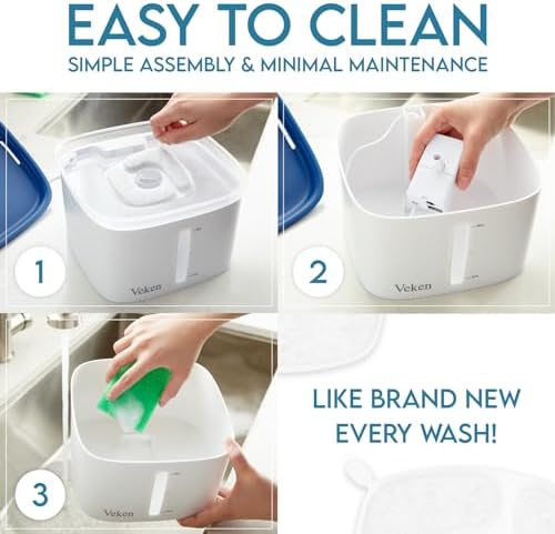 Large capacity: Staying hydrated is the key to preventing kidney and urinary tract diseases. The 95oz capacity makes this pet fountain water dispenser a perfect fit for small to medium dog breeds and all cats.    High-quality: Made of food grade materials, this drinking fountain is BPA free, durable, and easy to operate and clean. The water-level window and LED Light let you observe how much water your pets drink in real time, and lets you see exactly when you need to fill the water bowl. There is a switch on the wire to control the light so you could easily turn it on or off.    Two flow designs: The Veken Pet Fountain has 2 modes: flower waterfall (faucet drinking) and the gentle fountain. The water streaming down the petals of the flower on the fountain will draw your pets attention and encourage animals to drink more often.    5 stages filtration system: In addition to keeping water fresh via circulation, the 5 stages system, including coconut shell activated carbon & cotton layer, ion exchange resin and thick non-woven fabric, keeps water better tasting and safer for pets.    Ultra-quiet pump: The pump on this water dispenser is ultra-quiet, has low-energy consumption and will last 1.5-2 years.           #129 in Pet Supplies ( )   #1 in   #1 in