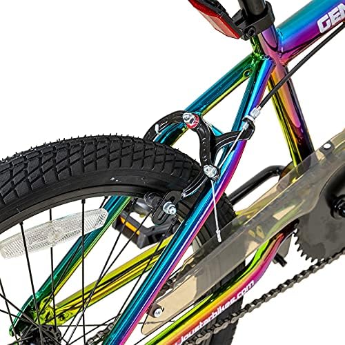 Freestyle & Color - With sleek gloss jelly paint, JOYSTAR Gemsbok is a stylish BMX style 20" kids bike that offers everything a beginning rider needs to hit the streets or bike park! It's an entry level bmx bike with standard 20” wheel size. Front pegs make it easy to try hops and tricks for boys and girls. Safer riding - 20 in kids bicycle with double hand brakes, front & rear caliper brakes provide more safety. Wide 2.125" pneumatic air tires add more stability, Sturdy steel frame and crank, Non-slip resin pedal, chainguard, front & rear reflectors and wheel reflectors. Easier to Ride - Your little ones will enjoy a smoother ride with Single speed drivetrain that features 130mm one-piece forged steel cranks with a 36T steel chainring and American loose ball bottom bracket. Brake lever allows little riders brake efficiently. Kickstand included. Easy Assembly - 85% of the bike is assembled. The front tire, the seat, pegs and handlebar need to be installed. Assembly tools included and it's easy to follow instructions. This boys and girls bike also come with timely customer service and also limited lifetime warranty. 20 Inch BMX Bikes - The Gemsbok bmx bike is ready to take on the sidewalk, dirt track, or park. Special Oil slick color for cool riding. Suggested rider height is 4'0"– 5'8" (ages 7+ years). Use our sizing chart and you will find the perfect size for your kids.