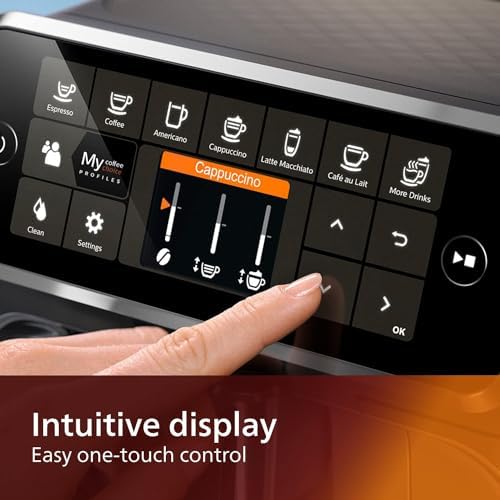 With Philips 4300 Series easily make up to 8 black and milk-based aromatic coffee varieties with the touch of a button! Enjoy the delicious taste and aroma of coffee from fresh beans at the perfect temperature    LatteGo Milk System: Top your coffee off with a silky-smooth layer of milk froth    Intuitive Touch Display: Select the perfect coffee for your mood with just one touch    My Coffee Choice Menu: Adjust the strength and quantity of your beverage and choose from three different settings to suit your preferences. The Aroma Extract system intelligently strikes the optimum balance between brewing temperature and aroma extraction    Powerful Filter and Easy Maintenance: Thanks to the AquaClean, enjoy clear and purified water - by changing the filter after being prompted by the machine, you will not need to descale your machine for up to 5000 cups