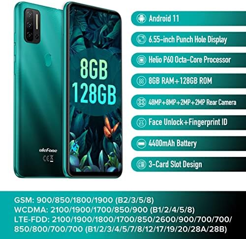 ✨ Android 11; 8GB RAM + 128GB ROM Micro SD up to 1T; MediaTek Helio P60 Octa-core processor    ✨ Ultra-Large 6.55-inch Punch-Hole Screen; 4400mAh with OTG function    ✨ 48MP AI Quad Camera, Samsung 48MP Camera, 8MP Ultra Wide-Angle Lens, 2MP Macro Camera, 2MP Sub-Camera; 8MP Front Camera    ✨ 3 independent card slots for dual Nano SIM and 1* TF card    ✨ 4G LTE (1/2/3/4/5/7/8/12/17/19/20/28A/28B) 3G: (B1/2/4/5/8): US compatibility Nationwide on most of GSM Networks including T-Mobile, Metro PCS, and others. ?Not compatible with AT&T or Cricket activations or with CDMA Networks like Verizon, Sprint, and Boost Mobile)