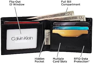 CK STYLE: Stay organized and stylish with this essential leather bifold wallet from Calvin Klein. This compact wallet is perfect for everyday use and fits in any pocket with ease. STORAGE CAPACITY: This wallet contains 6 card slots, 1 clear ID window, 2 slip pockets and 1 bill compartment to store your cash. RFID TECHNOLOGY: Crafted with an interior lining of RFID blocking fabric, this wallet is designed to help shield credit card and personal information. EVERYDAY FUNCTIONALITY: This modern designed wallet is the perfect balance of style and convenience. Whether you're planning to use for travel or everyday, this wallet will be a timeless accessory for any journey.         #47,056 in Clothing, Shoes & Jewelry ( )   #145 in
