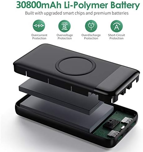 Portable Charger [15W Max Wireless Charging]: Wireless portable charger support 5W, 7.5W,10W and 15W Max wireless fast charging. Conveniently charge your devices up to 15W without connect cable.    25W PD Fast Charging & QC 4.0 Fast Charging Output: portable charger with 25W power delivery 3.0 output and quick charge 4.0 output, combine to deliver an optimized charge to your devices at up to 25 W. Fast charging for cellphone up to 100% within 1.5 hours.USB-C fast charging cable and PD wall charger full charge this portable charger within 3.5 hours.    Simultaneous Charging + Smart LED Indicators: Get a 15W wireless charge for your cellphones while charging another device via one of two micro usb outport (QC 4.0 +2.1A) or usb-c 25W PD port. The LED battery level indicator show the remaining battery level.You will know when this power bank need be charged.    High Capacity & Safe of Power Bank: 30,800mAh capacity can charge more than 8 times for iPhone 12 and 6 times for iPhone 12 pro max. power bank built-in intelligent chip can protect your devices against overcharge, over-discharge, excessive currents , short circuits or overheating.    What You Get: FOCHEW Wireless Portable Charger x1, Micro USB Cable x1 (Not including USB C cable), User manual x1. And 24 month warranty policy and 24 hours great customer service.    Tips: This portable charger not suitable for wireless charging of Bluetooth headphones.    The Wireless Portable Charger compatible with iPhone 15/15 Plus/15 Pro/ 15 Pro Max /iPhone 14/ iPhone 14 Por Max/iPhone 14 mini / iPhone 13 Por Max/13 Mini/13/12/11/XR/11 max/XS Max/X; iPhone 8 Plus/8/7 Plus/7/6s Plus/6 Plus/6/SE/5S; Samsung Galaxy S23/S22S21/ 20/S10/S9/S8 /Note20,Note10,Note9, Galaxy Z Flip4,Galaxy Z Flip3,Galaxy Z Fold3, Galaxy A73,A13,A33,A53,A52,A42,A32; LG G8, LG G7, LG X4, LG Q60, LG K40, LG Q7; Google Pixel, Google Pixel XL, Google Pixel 2 etc