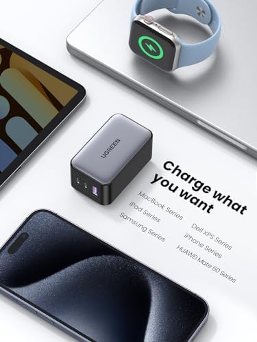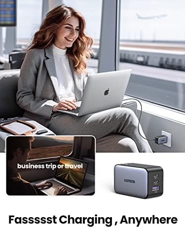 65W High Speed Single Port Charger: Connect a single USB C device to get a 65W max charge; Charge the MacBook Air M2 to 51% in 30 Minutes    One Charger, More Devices: Ugreen's 65W USB C charger provides an enormous 65W of charging power; enough to fast charge phones, tablets, and laptops; All from a single charger    Travel Friendly, Compact Design: Thanks to a cutting edge GaN chip, Ugreen's 65W USB C charger is 50% smaller than the original 61W USB C charger; A foldable plug provides more portability and a better travel experience    Power Dispenser System: An intelligent system that reallocates power to protect and extend your device’s health    Wide Compatibility: Broad support for multiple devices, MacBook Pro 16, MacBook Air M2 2022, MacBook Pro 13'' M2, iPad Pro, iPhone 15 Pro 14 13, Galaxy S24 Ultra S23, Switch, Steam Deck, and More