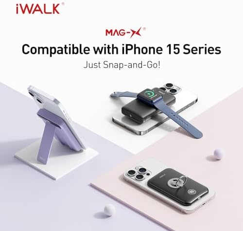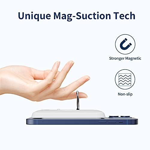 Mag-Safe Wireless Charger:Specifically for iPhone 15/14/13/12 wireless charging with unique Mag-Suction technology (stronger magnetic and nano adsorption) support iPhone 15/14/13/12 without case or cover with mag-safe case.    Fast Wireless Charging: Wireless portable charger support 7.5W iPhone 15/14/13/12 fast wireless charging.Also supports USB-C 18W PD input and output.    Smart LED Indicators: The LED power indicators shows the remaining battery capacity.    Finger Ring:Wireless power bank built in special finger ring holder designed to hold your iPhone 15/14/13/12 in place and also makes it be carried conveniently while talking on your iphone.    What you get:6000mah Wireless Power Bank,USB-A to USB-C Cable x1, User Manual x1