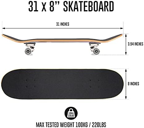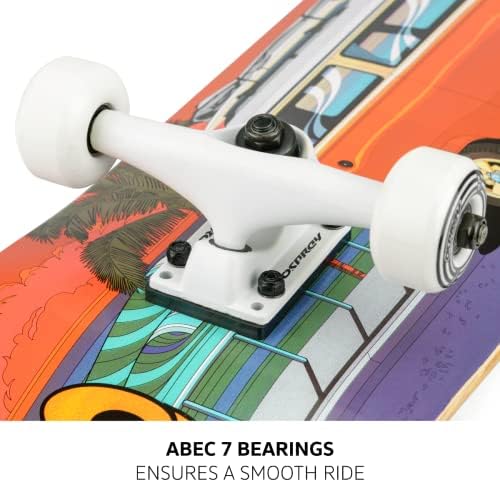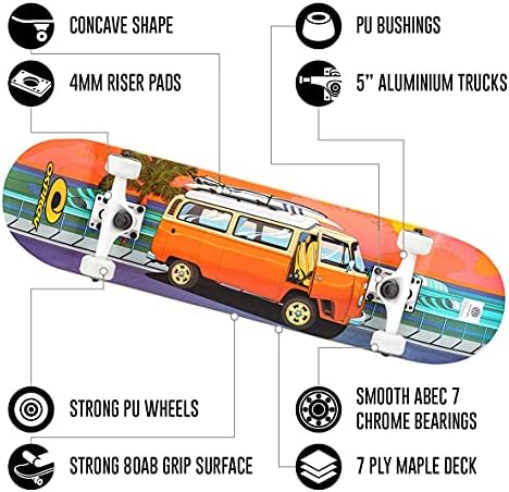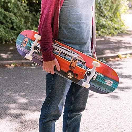 100% Maple    Imported    OSPREY OFFICIAL VOLKSWAGEN SKATEBOARD FOR ADULTS, TEENS AND BEGINNERS - Learn to ride and improve their skateboarding skills in style with this official licensed VW skateboard    DOUBLE KICK BOARD WITH CONCAVE SHAPE - Lets you perform tricks from the nose and tail of the skateboard with ease    STRONG AND DURABLE - Thanks to its 7 layer maple deck with a tested maximum user weight of 220lbs; great for adults, kids, and teens    EASY TO CONTROL - With its large board size (31 inch x 8 inch) and strong 80AB grip tape making it easier to stay balanced    ENJOY A SMOOTH, STURDY AND FAST RIDE - With the 4 mm riser pads, 99A bushings, heavy duty aluminum alloy trucks, 50 x 30 mm PU wheels and shock absorbing ABEC 7 chrome bearings