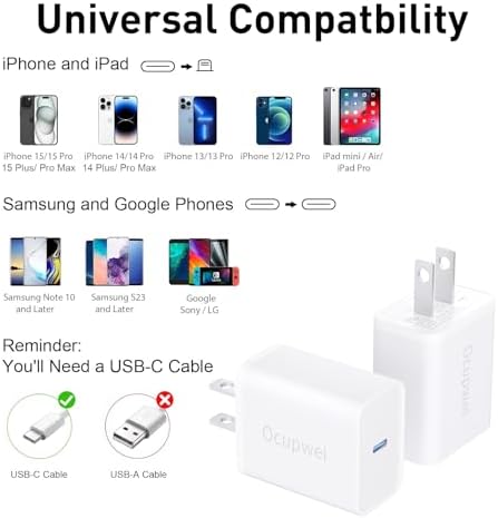【20W High-Speed Power】: Ocupwei Fast Charger Block equipped with 20W PD 3.0 USB Type C power delivery wall plug, PD 3.0 Quick-Charge USB C port provides Max 20W output power, charging your Phone from 0-50% in only 30 minutes, and other compatible devices at optimal speeds, saving time for you.    【Universal Compatibility】: No more trigger warning messages. Ocupwei USB C Charger Block is optimized to work flawlessly with all your mobile devices including Phone 15/15 Pro/15 Pro Max/15 Plus/14/14 Pro/14 Pro Max/14 Plus/ 13 / 13 Mini / 13 Pro / 13 Pro Max / 12 / 12 Mini / 12 Pro / 12 Pro Max, Phone SE, Phone 11 / 11 Pro / 11 Pro Max, Phone XS / XS Max / XR / X, iPad Pro 12.9 / 11 / Pad Air 3 / Pad Mini(2019), Google Pixel 7/ 6/ 5/ 4 / 4 XL / 3 / 3 XL / 2 / 2 XL, Galaxy S23/ S22/ S21/ S20/ S10 / S10+ / S10e / S9 / S9+ / S8 / S8+ / Note 10 or other devices that support USB Power Delivery.    【Safety Protection】:Suitable for the U.S. and the World electrical standards. Ocupwei Type C Wall Charger has ETL(US),FCC,CE,ROHS certification. The certified Charger Cube has an output power of 5v1a/ 5v2a/ 5v3a/ or 9v1a/ 9v2.2a. The charger is controlled by AI chip and matches the output power intelligently according to the power required by your device, ensuring safety and battery protection while quickly charging your device.    【Compact & Lightweight】: Extremely compact size & travel-friendly design, Ocupwei Compact USB-C Charging Brick sits flat to the wall to fit easily behind furniture or in hard-to-reach outlets. It's also perfectly-sized to fit in a pocket or bag. Efficient charging at home, in the office, or on the go.    【What You Get】: Ocupwei 20W USB C Power Delivery Charger Block - 2PACK. Worry-free 12-month warranty and 24/7 customer service, life time technical support.