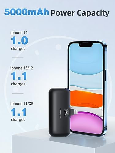 【5000mAh LCD Display Charger】 The portable power bank has LCD displays the battery numerically, let you know when need to recharge it before running out of battery. 5000mAh portable charger is officially MFi certified, lightweight with big capacity which allows at least fully charge once when charging without using the phone, charging starts just by plugging in, an ideal charging companion for travel and outdoor activities. 【Adjustable 4 Modes LED Light】 The portable battery charger has LED lantern that can be switched to 3 colors of warm - white - warm white, you can use it as fill light for selfies and flashlight in the dark. In additional the SOS flashing mode is designed for emergency, you can clearly send out a distress signal to get rescue in the case of distress. 【For All iPhone and AirPods】Portable Charger has an integrated connector and battery, can charge all your devices with this one battery pack charger, it's about the size of a car key weighs 92g, you can charge while gaming or calling. Widely compatible with iPhone 14 14 Pro Max 13 13 Pro Max 12 12 Mini 12 Pro Max 11Pro XS XR X 8 7 6 Plus Airpods and so on. 【Fast Recharging Function】Recharging the cell phone charger for 50% power within 30 mins with provided USB C cable and adapter(not included), which can charge your iPhone 13 from 20% to 60% without using the phone. It's equipped with the latest heat insulation chip to prevent overheating, moreover, it supports pass-through charging which allows you to charge the smartphone while charging the charger itself. 【Customer Satisfaction】We have a professional after-sales team, if you have any questions, please feel free to contact us. The Taegila thinner and smaller charger adds convenience to charging on the way, toss it into your bag which will ensure reliable charging for your iPhone wherever you are: home, travel, hiking, fishing, on the plane, etc. What you will get: 1*portable charger, 1*USB-C charge cable, 1*user manual.