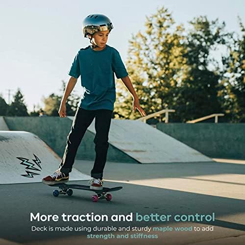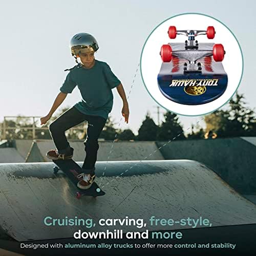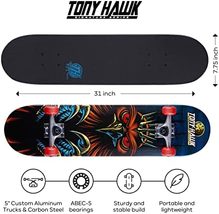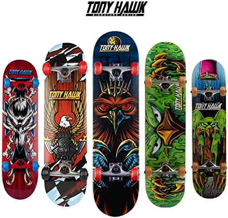 Perfect for Intermediate Riders: This 31 inch series 4 skateboard is a step up Pro Board with 5" Custom Aluminum Trucks & Carbon Steel ABEC-5 bearings that gives you just the right balance of convenience, safety, and stability.    Portable and lightweight: Thanks to a sturdy wooden build coupled with the lightweight, our skateboard for cruising makes the perfect companion for your outdoor trips and travels; it's easy to carry around making it ideal for anyone that wants to skate anywhere they want    Sturdy and stable build: The complete skateboard deck is made using durable and sturdy maple wood to add strength and stiffness while also gives it a stylish flair; it offers more traction for your feet and gives better control when skating    Tony Hawk Signature Series: The skateboard is suitable for all skill levels and part of the Tony Hawk Signature Skateboard Series. The skateboard provides just the right fit for Cruising, Carving, Free-Style, Downhill, and more while staying stylish the super cool graphics; it's designed with aluminum alloy trucks to offer more control and stability when riding    Thoughtful gift idea: If you're looking for a gift for family and friends that like to skate then our wooden cruising skateboard has you covered; it makes the perfect gift for Christmas, Birthdays, New Year's, Thanksgiving, and any other occasion you have in mind