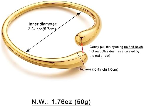 Adjustable Open Cuff Bracelet: The teardrop open cuff design ensures the gold cuff bracelet fits on your wrist perfectly and stays secure. The adjustable open cuff bangle bracelet fits most wrists. Comfortable Gold Cuff Bracelet: WOWORAMA teardrop cuff bracelet is plated with 18k gold and has a highly polished, smooth and shiny, hypoallergenic and long-lasting color retention, comfortable and safe for sensitive skin. Stylish Chunky Cuff Bracelet: WOWORAMA unique and stylish chunky gold bangle bracelet is classic in style and can be dressed up or down for any occasion, you can wear it alone or stack it with more bracelets to elevate your look. Fashion Jewelry Gifts: WOWORAMA chunky cuff bracelet brings elegance and luxury to the modern woman, perfect as a gift for mom, wife, sister, daughter or friends on Mother's Day, Valentine's Day, Birthday, Christmas and Anniversary. Please Kindly Note: We sincerely suggest that you wear this gold teardrop cuff bracelet in the following way: Gently pull the opening up and down, not to the sides, which will keep a better shape and longer time. Please feel free to contact us if you have any questions! #26,376 in Clothing, Shoes & Jewelry ( ) #12 in