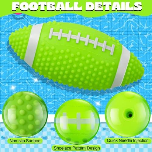 Built in LED Light for You: the glow in the dark football is in bright color and has built in LED light, you can tap the area near the inflatable hole to make the light on, it is very attractive and can add more happy atmosphere to the beach game with your friend    Non Slip Design: the swimming pool LED American football has an easy grip pebble surface and double laced hand sewn laces design, which provides nice grip in or out of the water and makes you more comfortable to throw and catch the football while playing pool games    Quality and Durable Water Toys to Serve You: the waterproof glow football is made of waterproof and durable PVC materials, it can endure rough playing, no need to worry about the water football breaking down and affecting your enjoyment too much, which can enhance the satisfaction of summer pool parties    Fill with Water or Air: this beach ball for pool has a needle adapter that can be inflated or filled with water; When our football is inflated, it can be applied at the beach, park, playground, backyard and more; When it is water filled, you can play with it in the pool or the ocean, it can meet your needs for different scenarios    Have Fun for the Whole Family: our waterproof football is nice pool toys for parties, playdate, and family time; It's a good gift for adults teens and more, taking it to the pool and beach games can add more fun