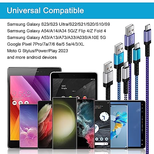 【MULTI-SIZE,6ft+5ft+3ft Fast Charging Cable】3PACK Google Pixel 7a 5g Colorful USB C to A fast charging cable cord (6ft+ 5ft +3ft) can remand your different requirement for charging. You can keep a longer cable for your home or office ,and keep a short cord on your car, and you can share the happy and convenience for your family and friend.Multi pack for your convenient fast charging with best price.    【USB C Compatibility】: USB-A to Type-C Fast Charging USB C Cable Compatibility for Moto G Stylus/Play/Power/Pure 2023 2022 (2021),Moto G71/G51/G41 5G,G10,G30,G 5G Plus,G Stylus/Fast,G9 Power/Plus/Play,Razr 5G,E7 Power,Samsung Galaxy Z Fold 4 3/Flip 4 3 5G,S23 Ultra 5g/S23+/S23/S22 Ultra 5g/S22+ 5G/S22/S21/S20 Fe Ultra 5G,S10+,Note21/20 Ultra 5g/10/9 F62 A03s/A54/A14/A34/A13/A33/A53/A73,A42/A32/A72/A22/A52 5G A12 A31 A21s,OnePlus 10/9/9Pro/9R/8 Pro/7T Pro/Nord N10 5G,Google Pixel 7a/7Pro/7/6Pro/6/5/4/3.    【Fast Charging and Data Sync】: The Samsung Galaxy S23 5g wall charger plug Type c cable built-in a 56kilohom resistor on Type-C connector,which ensure the transfer speed can reach achieve is 480 Mbit/s.3 Pack Android Phone USB C Cable accelerates the charging speed by delivering 5V/3A safe charging power. Provide long-term use.Data transfer and power charger 2 in 1 Type C cable for save you more time.    【Extra Durable & Safety】: HopePow’s Moto G Stylus 5G Nylon braided usb type c to usb A cable is made of a high-quality aluminum casing that makes the charger cable can bear over 10000+ test bending and adds additional durability and tangle free.(Pls Note: This is not Micro port or iphone port)    【What You Get】:3Pack(3ft+5ft+6ft) nylon braided usb c charging cable. IF YOU HAVE ANY QUESTION, PLE CONTACT US , WE will REPLY YOU within 24 HOURS.           #16,833 in Cell Phones & Accessories ( )   #403 in