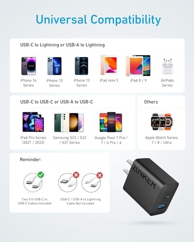 20W High-Speed Charging: Enjoy fast charging with 20W max output for your iPhone, Samsung phones, and other devices. Simultaneous Dual-Port Charging: With the ability to use USB-C and USB-A ports simultaneously, power two devices at once without compromising speed or performance. Small and Compact: Designed with portability in mind, take the compact charger with you wherever you go, ensuring that you never run out of power when you need it the most. Safety First: Rest easy knowing that Anker's MultiProtect safety system offers comprehensive protection for your devices, giving you peace of mind while charging. What You Get: Anker Charger (2-Port, 20W), 2-pack 5 ft USB-C to USB-C cable, welcome guide, 18-month warranty, and our friendly customer service.
