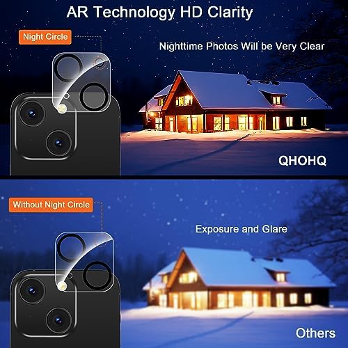 [Applicable Models]: The screen protector tempered glass and camera lens protector are only applicable for the iPhone 15 6.1 Inch version. They are made of high-quality 0.33mm thick tempered glass with a hardness of 9H grade or more, which has been strengthened at 800 degrees celsius to prevent shattered edges, scratches, and explosions. The iPhone 15 screen protector glass also features a 2.5D rounded edge design, which is touch smooth and won't scratch your hands.    [Special Note]: Due to the rounded design of the iPhone 15 and to enhance compatibility with most cases, QHOHQ designed the tempered glass screen protector does not cover the entire screen, only the flat area.    [Ultra Thin and Ultra HD Design]: 0.33mm ultra-thin tempered glass with super quick-launch application, maintain the same responsiveness and touch experience as a naked phone. It also ensure 99% retention of the original ultra HD picture quality. The surface of the iPhone 15 protective film is treated with a plasma oil repellent coating, effectively preventing fingerprints caused by sweat and oil stains and improving the visibility of the screen, thereby keeping the screen as clean as new.    [Easy Installation]: The screen protector iPhone 15 designed by QHOHQ comes with a simple installation frame that makes it very easy to align the tempered glass with your phone screen and will not leave any bubbles. Enjoy your screen as if the protector de pantalla doesn't even exist. Please watch our installation video tutorial before installing.    [AR Technology and Night Shooting Function]: The specially designed for the iPhone 15 camera lens protector incorporates the latest AR-enhanced "seamless" fusion technology, which enhances light transmittance and improves the quality of photos and videos. The camera cover upgrades the "Night Shot Circle" feature to maintain the original quality of photos and videos even when the flash is turned on at night.