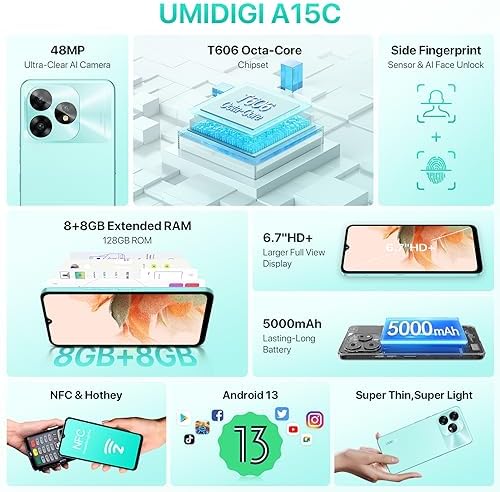 【16GB(8GB+8GB RAM) & Unisoc T606 Android phones】Umidigi A15C unlocked android cell phone powerful by Unisoc T606 Octa-Core Processor, Up to 16GB RAM (8GB +8GB Extended RAM) )and 128GB ROM Supports expandable storage up to 1TB. provides fast data transfer speeds and allows for quick app launches and smooth multitasking.    【Android 13 &5000mAh Lasting-Long Battery Unlocked phone】Say goodbye to battery anxiety with the Umidigi A15C smartphone's massive 5000mAh battery . the Umidigi A15C cell phone also supports 10W charging via USB Type-C, allowing you to quickly and easily recharge your phone.    【6.7"HD Large Full View Display mobile phone 】Umidigi A15C cell phones With a 6.7-inch Full HD+ display offers a truly immersive viewing experience. 1650*720 resolution allows for sharp and detailed images, 20.06:9 aspect ratio offers a wider display area for a more cinematic viewing experience. It is especially useful for mobile gamers who require precise and accurate touch input for games.    【48MP Ultra-Clear AI Camera phone】Umidigi A15C android smartphone equipped features dual 48MP AI rear camera that captures ultra-clear and detailed photos and videos. The phone also includes an 8MP front-facing camera that takes high-quality selfies and supports video calls.    【 Multifunctional NFC & Hotkey android cell phone】UMIDIGI A15C Powered by powerful sensors, NFC allows you to pay anywhere, anytime without any hassle. You can even use it as a virtual key for your home and office.Hotkey allows users to customize its features to their liking. For example, launching applications, taking screenshots or controlling device settings.    【Headset-free FM Radio & Dual Unlock android smartphone】With the UMIDIGI A15C, you can enjoy international FM radio or world radio without headphones. Side Fingerprint Sensor and Face Unlock , you can unlock your device, authorize transactions and more, provides users with a fast, convenient, secure, and personalized method of device authentication without the need for a password or pin.    【Globalbands & Dual SIM unlocked cell phones】Umidigi A15C smart phone support more than 30 bands,Support dual Nano-SIM card or Nano-SIM + dedicated Micro-SD expansion memory card.