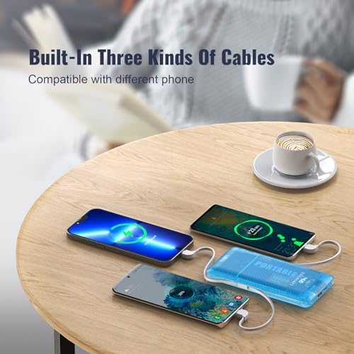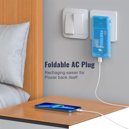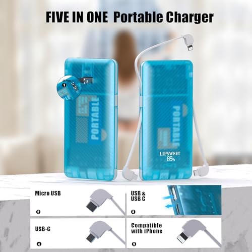 [New Version Portable Charger with Built in Cable]: Our portable battery charger built-in three cables for all different phones charge directly,no need extra cable.built-in in AC wall plug outlet for recharge.the semi-transparent case that allows you to see internal structure and design. This not only adds a futuristic touch but also instills confidence in its quality and reliability    [USB C 20W Power Bank Charger] The slim and handy 10000mAh high capacity portable phone charger with 6 in 1 compact design is easy to carry, support USB C 20W fast charge, when the Usb port or USB C port or the built in Usb C cable use alone support 20W .if use together will share as 5V 3A.extremely convenient for travel and daily use in charging electronic devices mobile phones, cameras tablets and so on    [Two Ways To Charge The External Battery Pack]the first way use the built –in AC wall plug for recharge the portable power bank ,will fully charge in 4.5 hours.the second way use the 5V 3A Usb C charging cable to charge the battery pack,suggest the fist way more convenience. UL2056 certificate. Intelligent power management IC provides power short circuit protection, over current protection, over voltage and over heat protection to ensure safe charging    [Slim and Compact size Portable Phone Charger with Digital battery Display]: the Portable battery Charger dimension is 5.9*2.8*0.55inch, which make it easier to carry, will not give you too much trouble when carrying out. Stay informed about your power bank's battery status with the easy-to-read digital display. This intuitive feature lets you know exactly how much power is remaining, so you can plan your charging needs accordingly    [Travel-Friendly Design with Portable Carrying Case Power Bank]: This power bank comes with a portable carrying case. Its compact size and lightweight construction make it the perfect companion for your travels, ensuring you have reliable power wherever you go. Additionally, using the built-in AC plug, providing you with a quick turnaround time and minimal downtime between charges    [What’s You Get]1x 10000mAh Portable Charger,1xnice carrying bag(easy to take anywhere),1x User Manual, any questions or problem will respond in 12 hours