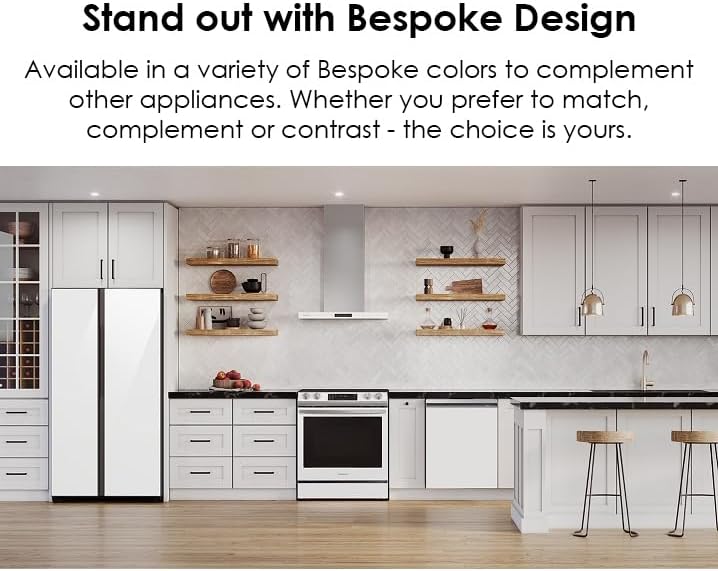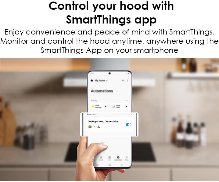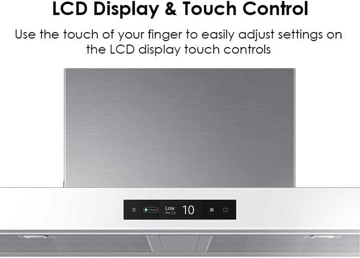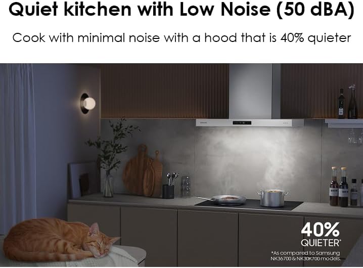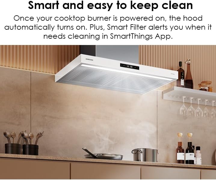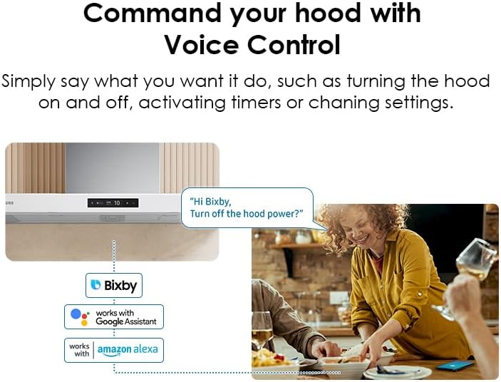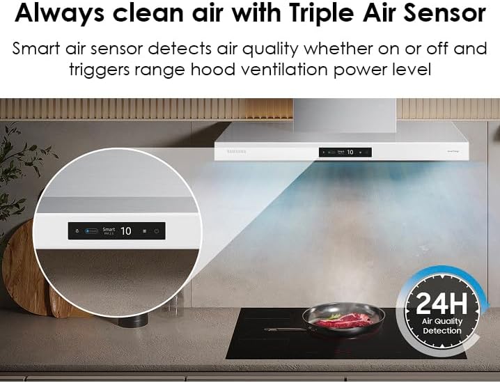 BESPOKE DESIGN: Available in a variety of Bespoke colors¹ to complement other appliances and express your personal style. Whether you prefer to match, complement or contrast – the choice is yours    TRIPLE AIR SENSOR: A quiet hood that helps you cook with almost no noise at 50 dBA and has smart air sensor to keep air quality detection all day long    WI-FI CONNECTIVITY: Monitor and control the hood anytime, anywhere using the SmartThings App on your smartphone; Automatically turns on once your cooktop burner is powered on    VOICE CONTROL: Control your hood by voice when you’re busy doing other things by using your favorite virtual assistant, whether it’s Samsung Bixby, Amazon Alexa or Google Assistant    LCD DISPLAY & TOUCH CONTROL: Use the touch of your finger to easily adjust settings on the LCD display touch controls