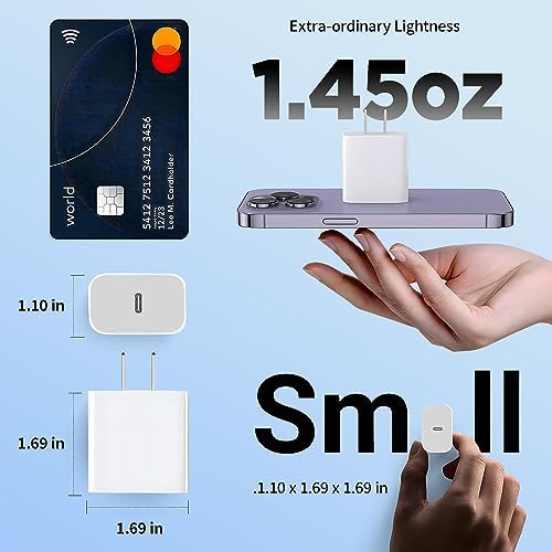 20W High-Speed Power: Fast charger equipped with 20W PD 3.0 USB Type C power delivery wall plug, provides Max 20W output power, charging your iPhone from 0-50% in just 30 minutes, saving over 1.5hrs for you. Charge your smartphone up to 70% faster than standard 5W charging.    Safe & Intelligent: 20W USB C charger block equipped with a smart chip, can detect each device’s power needs and adjusts the power flow automatically, Protect Your Devices from over Heating, Short-circuiting and over Charging.The shell is made of high quality ABS material, heat resistance and low temperature resistance, chemical resistance and excellent electrical properties.    Wide Compatibility: Type c charging block is optimized to work flawlessly with all your USB Type C devices including smartphones, tablets, wearables and more. Compatible with iPhone 15/15 Plus/15 Pro/15 Pro Max/14/14pro/14pro max/13/13 Mini/13 Pro/13 Pro Max/12 Series/iPhone 8 and later, AirPods Pro, iPad Mini 6, Android phones like Samsung S22/S21, Switch and more USB-C-enabled devices.    Compact & Lightweight: Extremely compact size & travel-friendly design fits into your pocket or bag easily without occupying too much space and ensures incredible portability wherever you go. 2 packs allow you to be more selective, one to keep for home use and one to take to the office, school, traveling, etc.    What You Get: 20W USB C Power Delivery Charger - 2PACKS(cable not included). Worry-free 12-month warranty and 24/7 customer service, life time technical support.