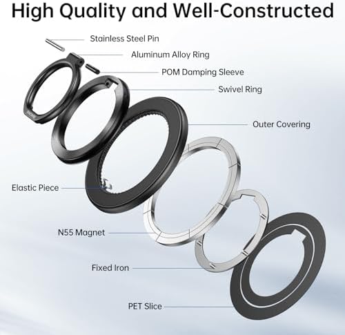 【Super Strong Magnetic】The Syncwire MagSafe phone ring holder is crafted with N55 NdFeB magnets to provide superb magnetic force. You can securely attach your phone to the MagSafe magnetic phone ring holder with just one finger, experiencing a firm hold that resists shaking or movement. The magnetic force is further enhanced when used with the provided metal rings.    【Double-Sided Magnetic】Features a unique two-sided magnetic design, so it work with MagSafe car mounts without the need to remove the ring. It can be attached to any magnetic metal surface, such as fitness equipment, fridges, bread machines, etc. The side attaches to the phone can hold up to 2.6-3 lbs(1.2-1.4KG), the magnetic force is enhanced to 10 lbs(5KG) used with the provided metal ring. Meanwhile, the back of the holder can hold weights of up to 2.2 lbs (1KG). (Tested by Syncwire Labs)    【360° Rotation & 90° Flip】Multi-angle adjustment provide flexible & comfortable hand grab and excellent viewing angle. This ring holder is tested to withstand over 6000 times of folding without getting loose, greatly improving durability.    【Unique Decompression Design】A patented structure that combines gears with spring plates for positioning, ensuring enhanced stability. By rotating the ring, it produces a satisfying clicking sound, providing an effective method of stress relief. The innovative design ensures a unique experience, enabling users to alleviate tension and find relaxation in a simple yet enjoyable manner.    【User-Centered Design】The ring incorporates a flat bottom design that forms a long fulcrum, providing enhanced stability and preventing any wobbling when your phone is placed horizontally or vertically. Additionally, the inner groove shape design of the ring allows for effortless pulling, no more struggling to pull the ring out.    【Work for All Phones】The Syncwire MagSafe phone ring holder is designed specifically for use with MagSafe devices and certified MagSafe phone cases. The magnetic phone ring grip is also compatible with non-magnetic phones and standard phone cases with thin metal rings (provided) on their backs. Widely compatible with all Apple and Android smartphones, including iPhone 15/14/13/12 Series, iPhone 11/11Pro/X/XS/XS Max/8/7, Samsung Galaxy, Google Pixel, and more.    【Experience Ultimate Versatility with the Syncwire MagSafe Phone Ring Holder】 – The perfect hands-free solution for busy commutes on crowded buses or subways. Transform your daily routines by effortlessly placing it on your office desk, kitchen counter, or table. Whether you're watching movies, listening to music, applying makeup, or making video calls, this phone ring holder enhances every aspect of your life with convenience and style.