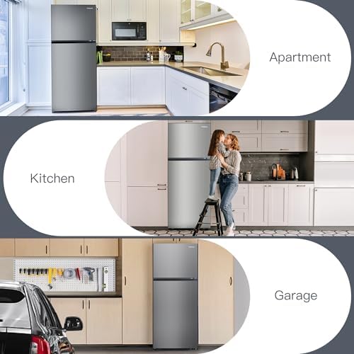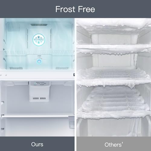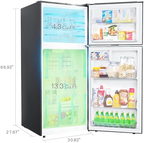 【LARGE CAPACITY & SPACE SAVING】 This top freezer refrigerator offers a generous 17.6 cubic feet capacity. The upper layer features a 4.3 cuft freezing area, while the lower layer provides a 13.3 cuft refrigeration area. It's an excellent choice for keeping cool drinks, fruits, vegetables, meat, and other fresh foods.    【ENERGY SAVING & LOW NOISE】 The top-mount refrigerator utilizes an R600a high-efficiency, low-energy consumption compressor, which cools food quickly while consuming less energy and producing minimal noise. Interior bright LED lighting makes it convenient to locate the food you need. It features a two-way airflow system, ensuring even and balanced airflow inside, and provides a long-lasting, balanced freshness preservation space.    【NO FROST OPERATION】 No More Defrosting Hassles! Frost-free refrigerators are equipped with a system that automatically defrosts the freezer and prevents the buildup of frost and ice. Frost-free refrigerators help preserve the quality and flavor of your food items, reducing food waste. With no need for manual defrosting, there is no wasted space due to ice buildup.    【REVERSIBLE DOOR】 A reversible door adds convenience, allowing you to adjust the door swing to suit your kitchen, apartment, RV, garage, camper, or basement.    【AFTER SALES SERVICE】 Our full size refrigerator come with a one-year warranty period. During this time, if you encounter any problems with your refrigerator, please feel free to contact us, and we will be happy to assist you in resolving them.
