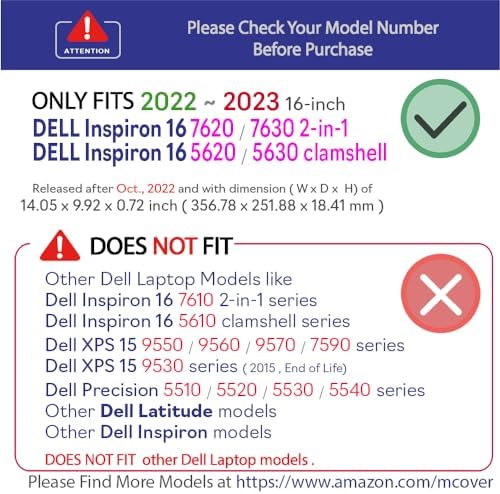 ☞⚠❤️?⭕️‼️ NOTE: Before placing order, PLEASE make sure to verify your laptop model number as this case is MODEL specific and NOT interchangeable. ‼️⭕️?❤️⚠☜    ❌‼️?⭕️ NOT fitting other Dell Inspiron or Latitude laptops. NOT compatible with ANY other Dell laptops as well. ❌‼️?⭕️    Made of high-quality translucent polycarbonate material which is shatter-proof and will protect your 16-inch Dell Inspiron 7620 / 7630 2-in-1 or Inspiron 5620 / 5630 clamshell Windows Notebook Computers all around    Designed to perfectly fit the 2022~2023 16-inch Dell Inspiron 7620 / 7630 2-in-1 or Inspiron 5620 / 5630 clamshell Windows Notebook Computers with dimension of 14.05 x 9.92 x 0.72 inch ( 356.78 x 251.88 x 18.41 mm )    2-piece light-weight( 10.1 oz or 286 g ) shell easily snaps on and off.