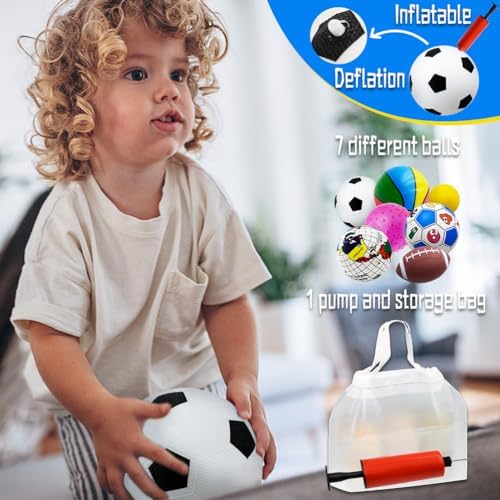 GREAT VALUE 7-PIECE SPORTS PUZZLE BALL SET! Comes with 1 pump(metal pin),Colorful Basketball (7in), Soccer Ball (6.2in), Football (5.9in), Thorn Ball (6in), Volleyball (4.7in), Earth Pattern Ball (8.5in), Number Soccer Ball (8.5in). Carefully put together set, the perfect for little hands to grip and play with for outdoor activities and the kids can enjoy a variety of games.    FUN SPORTS BALL TOY: Our kids ball is soft and easy to hold and throw. Bright colors, different pattern balls, children can play tumbling, counting colors, games or put them in the ball pit. Attract children's attention and cultivate color recognition and hand and foot coordination.    PLAY ANYTIME, SAFE: It has passed the official CPC safety certification and complies with toy safety requirements. Perfect for indoor and outdoor play,children will not be bored when traveling outdoors, perfect for practice and outdoor play - exercise learning, sports fun? Yes - have fun and love sports! Give your child a fun set of ball toys for kids.    BEST GIFTS: Infants and toddlers are the golden period for babies to grow up!Don't let the children continue to be addicted to electronic products! Encourage a healthy and active lifestyle with the sports ball set.Promoting exercise from an early age can lead to a great body and a better life for your child by keeping them positive, brave and alive. Surprise your little ones on special occasions like birthdays or holidays.    100% SATISFACTION GUNARANTEED: You can rest assured that if for any reason you are not 100% satisfied, contact us immediately and we will refund your money no questions asked. Make you 100% satisfied and provide the best customer service!
