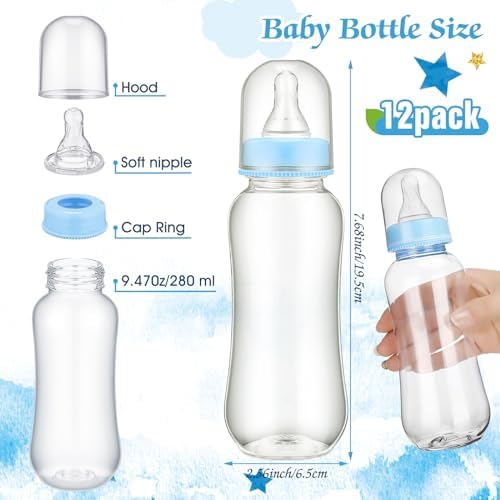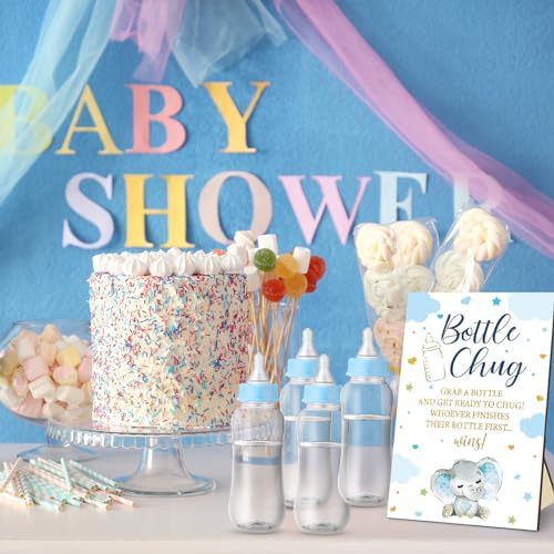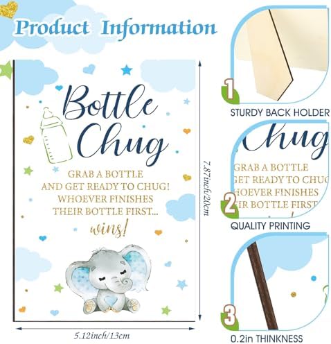 Wide Application for Various Occasions: not just for baby showers, this baby bottles for baby shower game can be applied for various occasions such as birthdays, weddings, bridal showers, and many more; The package includes 1 game sign and 12 baby bottles, which are ideal for large gatherings    Exquisite and Detailed Design: the blue elephant design of the baby shower bottle game sign add a touch of elegance and sophistication to your party, making it a good choice for those seeking to enhance their decor and add a unique touch to their event    Quality and Durable: made of quality wood, the baby bottles for wooden baby gift sets sign is sturdy and durable, while the baby bottles are made of silicone teats and PET, and are safe for use in a long time, you can reuse them for many baby showers to come    Detailed Size: the game sign measures about 5.12 x 7.87 x 0.2 inches, and the plastic baby bottles for baby shower has a height of 7.68 inches, a bottom diameter of 2.56 inches, and hold up to 9.5 oz/ 280 ml of liquid; The detailed size of all components ensures that they are fit for purpose and will work well in any baby shower setting    Memorable and Fun Baby Shower Game: baby shower games make your baby shower unforgettable with the party favors, both the sign and bottles have an exquisite design that adds a charming touch to your party; The game is easy to play and ideal for creating a joyful atmosphere during the celebration