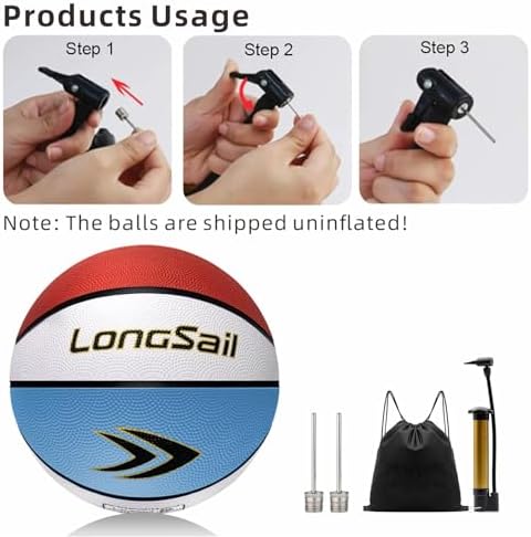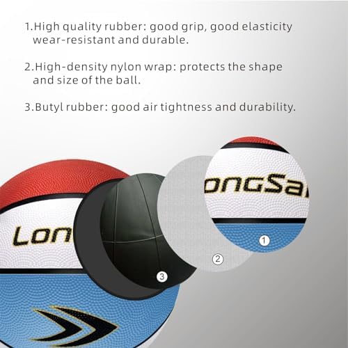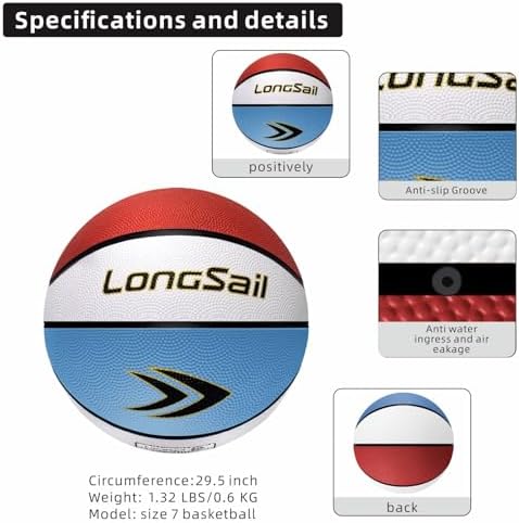 ?【BUID to LAST】 Crafted from premium-grade rubber, this basketball is not only environmentally friendly but also free from any unpleasant odors. Its high-quality construction ensures minimal deformation, color fading, or discoloration.    ?【OFFICIAL SIZE】29.5" Size 7 basketballs are ideal for 12+ teenagers and adult men& women players, meeting official game standards. We have also designed women's basketball/ girl's basketball in color schemes, which make ideal Christmas choices.    ?【STRICT CHOICE of MATERIAL】Our basketballs are made of premium eco-friendly rubber that resists deformation and fading. Each Longsail basketball undergoes rigorous impact testing to ensure excellent durability.    ?【SUPERIOR AIR RETENTION and BOUNCE】With a leak-proof air valve, about 500 denier nylon winding tire, ensuring exceptional air retention, deformation resistance. With impressive bounce performance, they enhance shooting, jumping, and passing crossovers, or delivering precise passes.    ?【EXCELLENT GRIP】Featuring a deep groove structure and heightened rib design, our basketball balls offer enhanced ball handling capabilities. This innovative design facilitates easier ball grip, providing superior touch and control.