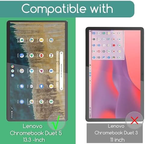 Compatible with the Devices: Screen Protector for Designed for Lenovo Chromebook Duet 5 (13.3 inch),Please double-check your device model to avoid buying the wrong one!    9H hardness & explosion proof: Tempered Glass Screen Protectors have a hardness rating of 9H, which means they are so tough that they can withstand scratches from sharp objects such as keys, coins and knives. Very strong scratch-resistant surface. 2.5D rounded edges. In the event of a strong impact or accidental drop, the tempered glass screen protector prevents shattering and keeps the screen intact, providing protection for both the device.    High Definition: Tempered glass screen protector adopts ultra-clear and transparent design, which can provide clear and vivid high-definition display effect without distortion or blurring.    Oil and dirt resistant: Tempered glass screen protectors are coated with a special oil and dirt resistant layer that helps prevent fingerprints, sweat and other oils from adhering to the screen, making it easy to clean and maintain. Protect your finger skin from damage, the oleophobic coating reduces screen smudges and fingerprints.    Packing List: Tempered Glass screen protector x2,Video operation guide stickers,Screen Mounting Kit Package, If you have any questions, please feel free to contact us, we will do our best to make you satisfied