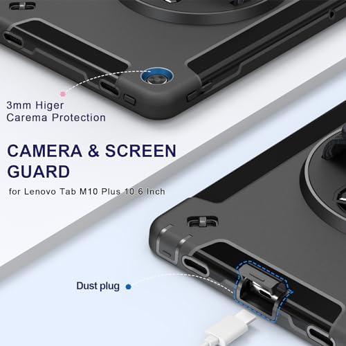 Miesherk Case for Lenovo Tab M10 Plus 3rd Gen: Military Grade Shockproof Case for Lenovo Tablet M10 Plus 10.6" TB-125F/TB-128F with Screen Protector-Rotating Stand-Hand/Shoulder Strap-Black