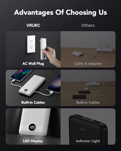 [Portable Charger With Built-in Cables & AC Wall Plug] This portable charger not only features built-in Micro, USB-C, and for iPhone charging cables but also includes USB and USB-C ports for added versatility. Moreover, the portable phone charger incorporates a built-in wall plug, enabling direct charging of the power bank from a wall outlet.    [Supports Up to 22.5W Fast Charging] This portable charger with cables supports 22.5W fast charging through its USB port. Additionally, it boasts built-in cables supporting PD 20W and QC 18W, ensuring efficient and rapid charging capabilities.    [Slim & Compact Design] With dimensions of 5.9 x 2.8 x 0.7 inches and a weight of 8 ounces, this product's slim and compact design enhances on-the-go convenience without adding extra weight.    [Smart Digital LED Display] The smart digital LED display provides a quick overview of remaining power. Additionally, the 3D texture on the surface enhances the tactile experience, offering a better 3D touch and grip to prevent slipping of the power bank and connected devices.    [Wide Compatibility] Utilizing the built-in charging cables, this portable battery charger is compatible with iPhones, Android devices, and most USB-C mobile phones and smart devices, catering to a wide range of daily charging needs. This external battery power bank meets the demands of various devices.    [Product Package] Each package includes 1 Power Bank and 1 User Manual, ensuring a hassle-free user experience.