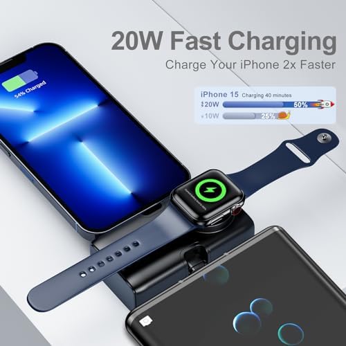 ✔️Pocket-Sized Power: Equipped with a built-in LT and Type C port connector,compatible with Apple Watch Series making it easy to charge your Apple devices without having to carry an extra cable.    ✔️Portable Travel Charger:Compact and lightweight , you can easily put this portable charger in your pocket or hang it on your backpack, which is a great travel companion.Equipped with a holder, it can stabilize your iPhone, providing added convenience for various scenarios.    ✔️Compatibility Charge Multiple Devices :This portable battery charger is widely compatible with iPhone 15/14/13/12/Pro Max series, Apple Watch 9/8/7/6/5/4/3/2/1/SE/Ultra, as well as other Type C Android devices or tablets.    ✔️PD 20W Fast Charging : The built-in cable supports PD 20W fast charging, providing your iPhone with 60% juice in 30 minutes,Power your device quickly and efficiently.    ✔️Superior Safety Features: Portable charger battery pack has built-in over temperature, over current, over voltage and short circuit protection to ensure you use the product safely.