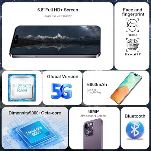 【6800mAh large battery】 The cell phone is equipped with a large 6800mAh battery, saying goodbye to battery anxiety. When you are still worrying about batteries, please choose it! Trust me, you don't need to charge it all the time, because its battery is very big enough for you to use, and it is enough to meet your daily needs! you can immerse yourself in everything this phone has to offer without constantly worrying about charging. Whether you're on a long road trip, exploring new places, or just making it through a busy day at work, this powerful battery ensures your smartphone stays charged when you need it most. 【6.8 HD+ for Android 13.0】Please note that this is an Android phone with a large perforated screen, 2.5D curved edges, and a premium heat bending glass back cover. 5-point capacitive touchscreen. Magnesium aluminum body. Facial recognition, on-screen fingerprint unlock to protect your privacy. comfortable to hold. Adopts facial recognition and on-screen fingerprint unlocking to better protect your privacy. 【Excellent camera features】 Unlock your photography potential with our smartphone’s powerful 48MP+108MP dual camera setup. helping you capture and record the most exciting memorable moments with high-quality images or videos, perfect for indoors outdoors. From stunning landscapes to intimate portraits, this camera system allows you to be creative and record life's precious moments with extraordinary clarity. Say goodbye to blurry, low-quality photos - with this smart phone you can capture and share high-resolution images that are truly eye-catching. Let your photography skills shine with the exceptional features of our smartphone dual camera setup. 【Global band and dual SIM 5G mobile phone】This machine adopts 5G smartphone 5G smartphone has faster transmission speed, short time delay, high positioning accuracy, wide link for customers to feel a more advanced experience. experience. 【Cell Phones+Giveaways】You'll receive not only the A15ProMax phone but also a box, a user manual, a charger adapter, a USB C data cable, a pair of headphones, a protective screen and a case