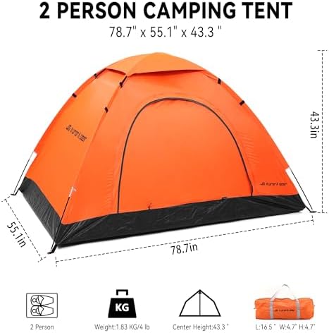 ?2 Person Tent:This lightweight two person small tent has enough space for you and a friend. This tent for camping is ideal for hiking, fishing, weekend music festivals, or as a beach tent, making it the perfect addition to your camping essentials.    ?Conventient Features: The tent for beach features fiberglass poles, a removable rain fly to protect against unexpected weather, a ventilation window to encourage comfortable airflow.    ?Dual Layer Door:The combination of the inner screen layer and the outer zippered fabric layer of the easy-up tent door provides plenty of air as well as privacy. Simply secure the doors with sewn-in ties to let the breeze in and keep mosquitos out.    ?Easy to Set UP:The tents for camping 2 person that can be quickly assembled within 3 minutes and easily assembled by one person according to the procedures and instructions sewn inside the bag.At the end of your trip, simply return the tent assembly to the included carrying bag for easy storage with your other camping accessories.    ?Product Details - Materials: 190T Polyester and Fiberglass.Silver Coated Tent Liner,Shade against sunlight and UV rays.Dimensions: (L) 78.7" x (W) 55.1" x (H) 43.3"; Pole Diameter: 6.9mm; Carrying Bag: (L) 16.5" x (W) 4.7". Weight: 4lbs. Capacity: 2 People. Color: Orange and Gray.    ?Durable Material:Keeping yourself, your camping equipment, and your personal items dry when you are camping is half the battle. The sturdy nylon material on the tent body and the convenient rain fly help to ensure water does not make its way into the inside of your tent for an enjoyable, and dry, trip!    ?Great for All Occasions – Get the most out of your two person tent during the year! The fiberglass poles and ventilation window allow you to utilize this tent for activities in the spring and summer. So, whether you need a tent for traveling, backpacking, hiking, festivals outdoors or whether you are headed out for a weekend camping trip with family and friends, this is an ideal tent to fit your needs.    ?Responsible & Prompt Customer Service:Any material or workmanship problem happens, please contact with us first for a satisfied solution.