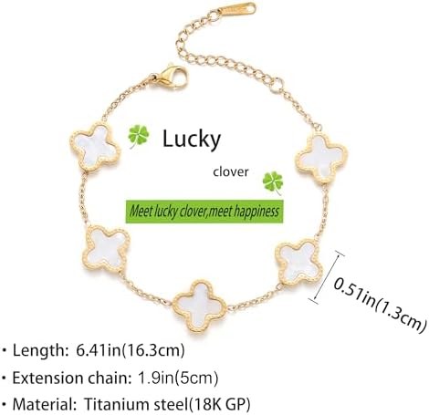 ?CLOVER BRACELET:Legend four-leaf clover symbolizes luck, one hundred thousand beads of clover can only find a four-leaf clover, four leaves respectively represent true love, health, reputation, wealth! ?SIZE INFORMATION: The Clover Bracelet is 6.41 "+1.9" extension chain, adjustable extension chain design meets most wrist requirements. ?EXQUISITE TECHNOLOGY: The bracelet is made of high-quality stainless steel material, strong, does not fade, but will not let your skin turn green, you can wear at ease! ?PERFECT GIFT:Dainty lucky clover bracelets are the best gifts for wives, girlfriends, mothers and daughters on Thanksgiving, Mother's Day, Christmas, birthdays, Valentine's Day and other holidays. ?SATISFACTION GUARANTEE: We offer a 90-day no-reason money back policy, so you can purchase with confidence. Should you have any questions or concerns, our professional customer service team is always available to help you. #3,887 in Clothing, Shoes & Jewelry ( ) #5 in